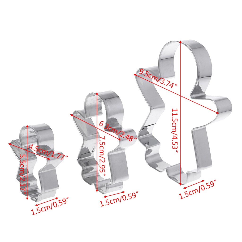 Cookie cutter shapes has 3 different sizes gingerbread cookie cutter. ~ Made from polished stainless steel, easy to through veggies /pastry effortlessly, just cut simply by pressing down with your palm. ~ Suit for making pretty salad, fondant cake, biscuit, cookie, sushi, fruit, vegetable, butterfly noodle. ~ Suitable for Christmas, valentines day, birthday, Halloween, thanks giving, easter, baby showers, bachelorette party, classroom activity and etc, also great for boys and girls' birthday parties. 姜饼人模具有 3 种不同的尺寸。 ~ 由不锈钢制成,只需用手掌按下即可切割。 ~ 适合制作漂亮的沙拉、软糖蛋糕、饼干、曲奇、寿司、水果、蔬菜、蝴蝶面。 ~ 适合圣诞节、情人节、生日、万圣节、感恩节、复活节、迎婴派对、单身派对、课堂活动等,也非常适合男孩和女孩的生日派对。