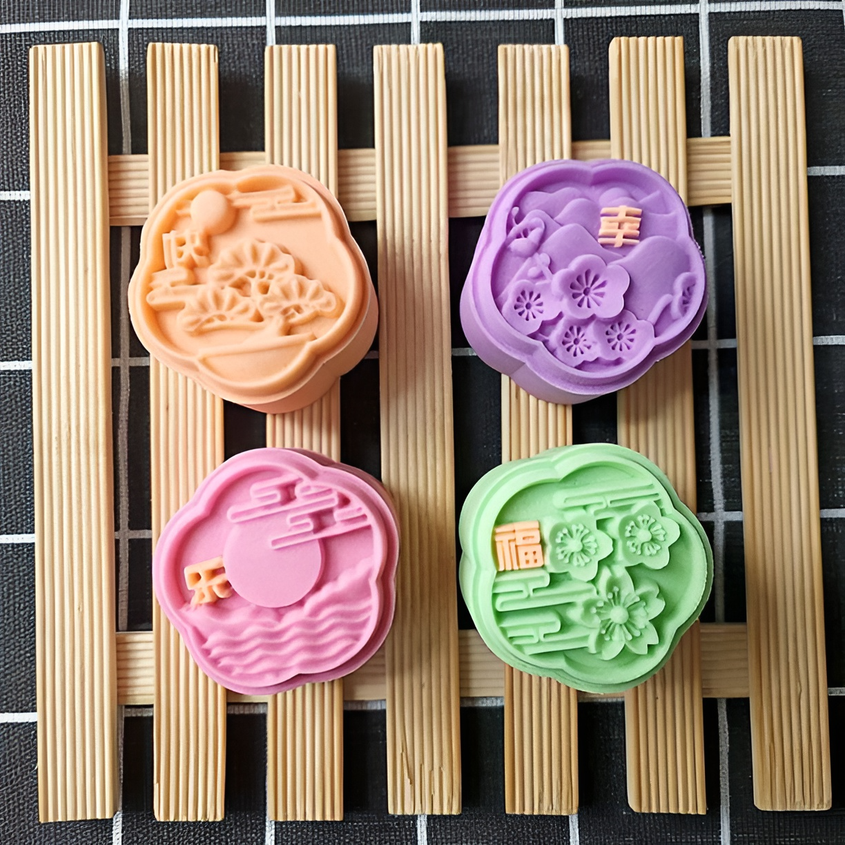 Product Name 产品名称 : 50G - 4pcs Happiness Plum Flower Mooncake Mould (MC709) 4片50克幸福快乐梅花传统月饼手压模具