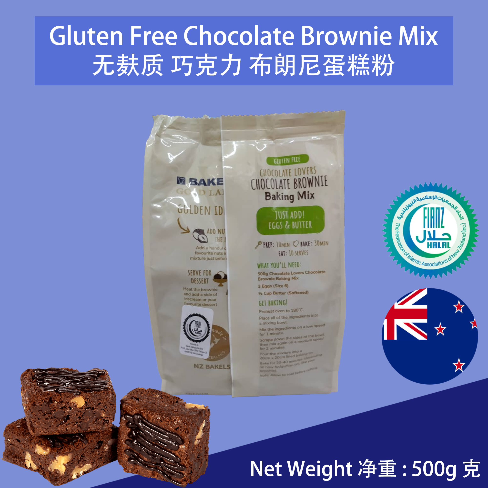 This premium gluten-free chocolate brownie cake mix is sourced directly from New Zealand, ensuring top quality for your baking needs. 此款优质无麸质巧克力布朗尼蛋糕粉原装进口自新西兰,品质卓越,满足您的烘焙需求。