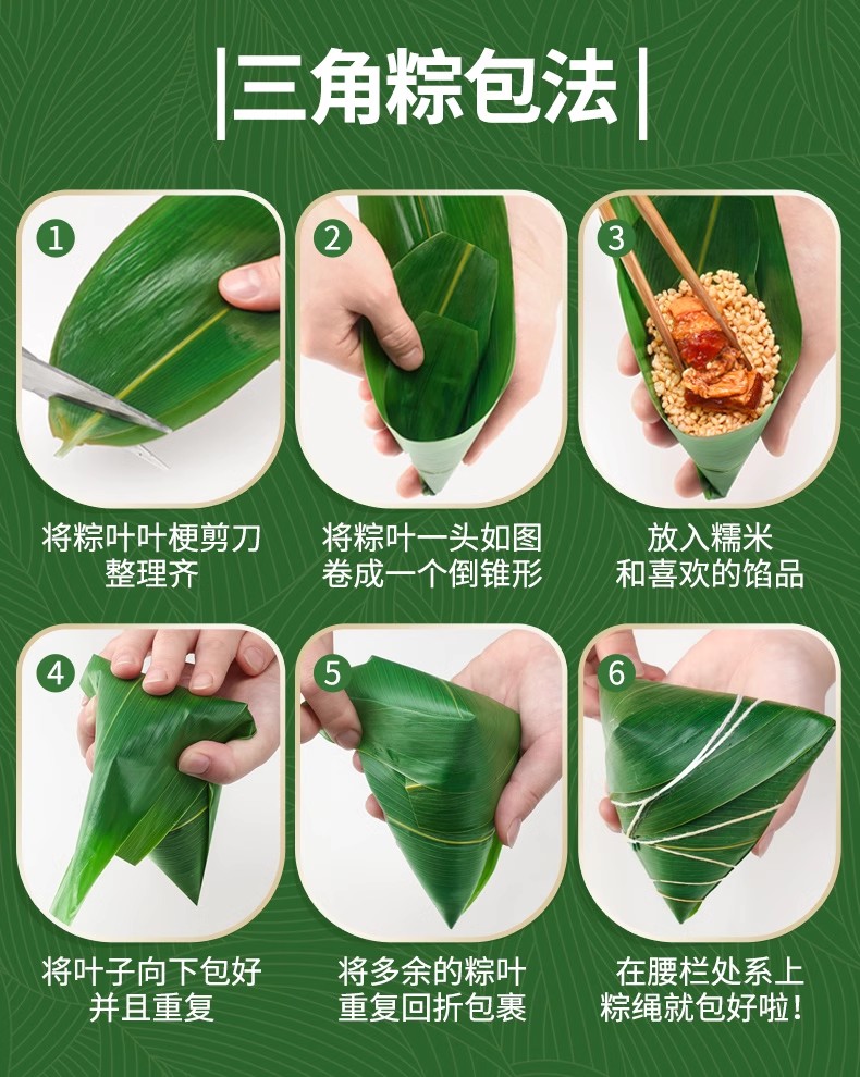 These premium bamboo leaves are ideal for wrapping Chinese sticky rice dumplings (Zongzi), commonly enjoyed during the Dragon Boat Festival. Carefully selected and vacuum packed for freshness, these leaves are flexible, durable, and rich in natural fragrance. 精选优质竹叶,适合包制中国传统粽子,尤其用于端午节期间。每片粽叶均经过筛选并真空包装,保留新鲜,叶片柔韧、耐煮、自然清香。